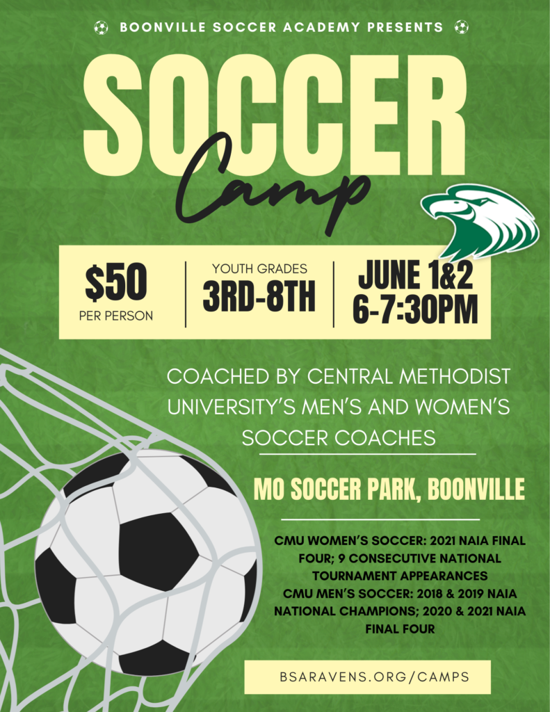 Join us as we host Central Methodist University’s Men’s and Women’s soccer coaches for a special two-day camp. The camp is open to boys and girls 3rd-8th grade and is an amazing opportunity to learn from coaches who have brought their teams to multiple national championships! Two days only, June 1st & 2nd, from 6-7:30pm at the Missouri Soccer Park in Boonville.